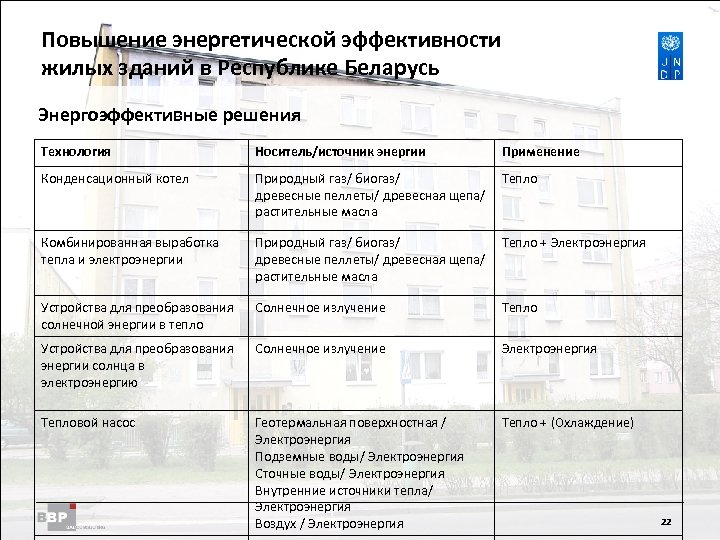 Повышение энергетической Residential Buildings Improving Energy Efficiency in эффективности жилых зданий в Belarus in the Republic of Республике Беларусь Энергоэффективные решения Технология Носитель/источник энергии Применение Конденсационный котел Природный газ/ биогаз/ древесные пеллеты/ древесная щепа/ растительные масла Тепло Комбинированная выработка тепла и электроэнергии Природный газ/ биогаз/ древесные пеллеты/ древесная щепа/ растительные масла Тепло + Электроэнергия Устройства для преобразования солнечной энергии в тепло Солнечное излучение Тепло Устройства для преобразования энергии солнца в электроэнергию Солнечное излучение Электроэнергия Тепловой насос Геотермальная поверхностная / Электроэнергия Подземные воды/ Электроэнергия Сточные воды/ Электроэнергия Внутренние источники тепла/ Электроэнергия Воздух / Электроэнергия Тепло + (Охлаждение) 22