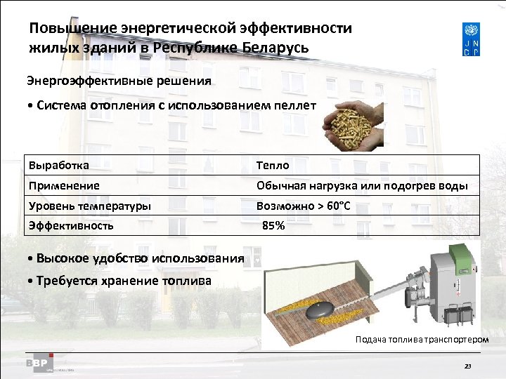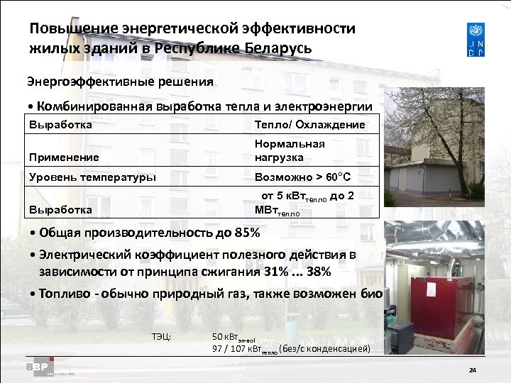 Повышение энергетической Residential Buildings Improving Energy Efficiency in эффективности жилых зданий в Belarus in the Republic of Республике Беларусь Энергоэффективные решения • Система отопления с использованием пеллет Выработка Тепло Применение Обычная нагрузка или подогрев воды Уровень температуры Возможно > 60°C Эффективность 85% • Высокое удобство использования • Требуется хранение топлива Подача топлива транспортером 23