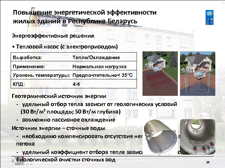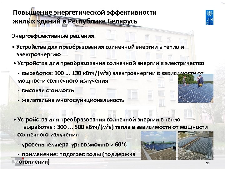 Повышение энергетической Residential Buildings Improving Energy Efficiency in эффективности жилых зданий в Belarus in the Republic of Республике Беларусь Энергоэффективные решения • Устройства для преобразования солнечной энергии в тепло и электроэнергию • Устройства для преобразования солнечной энергии в электричество - выработка: 100. . . 130 к. Втч/(м²a) электроэнергии в зависимости от мощности солнечного излучения - высокая стоимость - желательна многофункциональность • Устройства для преобразования солнечной энергии в тепло выработка : 300. . . 500 к. Втч/(м²a) тепла в зависимости от мощности солнечного излучения - уровень температур: возможно > 60°C - применение: подогрев воды (поддержка отопления) 25