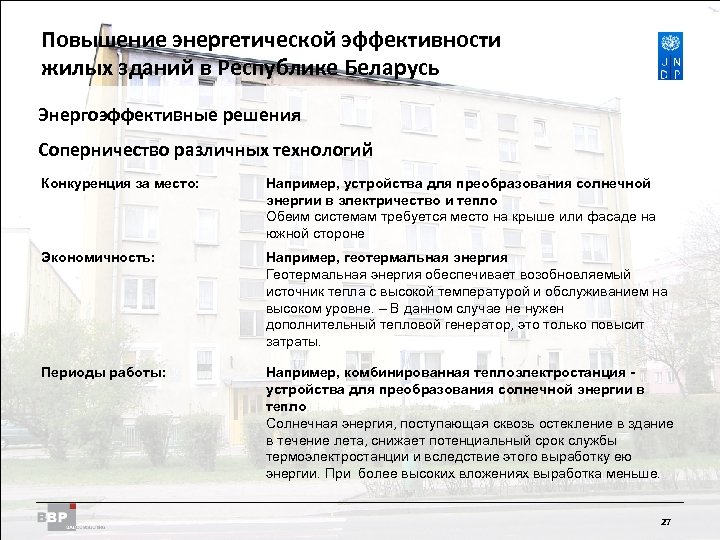 Повышение энергетической Residential Buildings Improving Energy Efficiency in эффективности жилых зданий в Belarus in the Republic of Республике Беларусь Энергоэффективные решения • Тепловой насос (с электроприводом) Выработка: Тепло/Охлаждение Применение: Нормальная нагрузка Уровень температуры: Предпочтительно< 35°C КПД: 4 -6 Геотермический источник энергии - удельный отбор тепла зависит от геологических условий (30 Вт/м² площадь; 50 Вт/м глубина) - возможно пассивное охлаждение Источник энергии – сточные воды - необходимо компенсировать отсутствие непрерывности входящего потока - удельный коэффициент отбора тепла зависит от процессов биологической очистки сточных вод 26