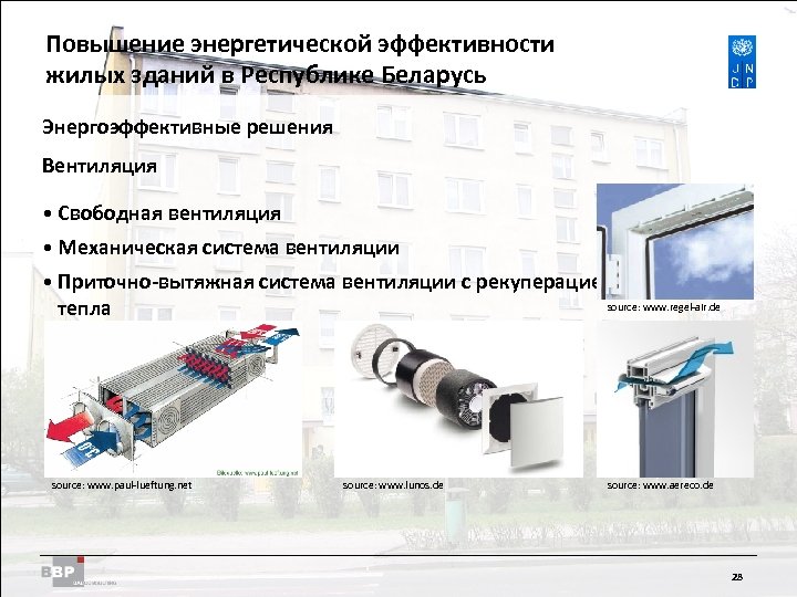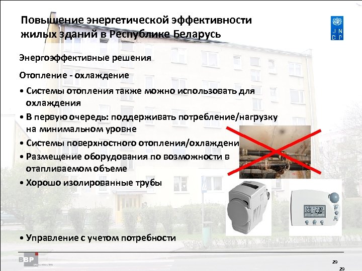 Повышение энергетической Residential Buildings Improving Energy Efficiency in эффективности жилых зданий в Belarus in the Republic of Республике Беларусь Энергоэффективные решения Вентиляция • Свободная вентиляция • Механическая система вентиляции • Приточно-вытяжная система вентиляции с рекуперацией source: www. regel-air. de тепла source: www. paul-lueftung. net source: www. lunos. de source: www. aereco. de 28