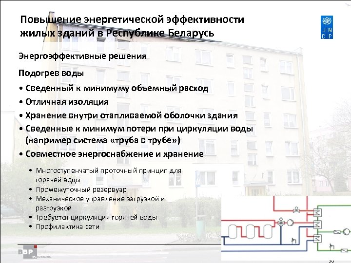 Повышение энергетической Residential Buildings Improving Energy Efficiency in эффективности жилых зданий в Belarus in the Republic of Республике Беларусь Энергоэффективные решения Отопление - охлаждение • Системы отопления также можно использовать для охлаждения • В первую очередь: поддерживать потребление/нагрузку на минимальном уровне • Системы поверхностного отопления/охлаждения • Размещение оборудования по возможности в отапливаемом объеме • Хорошо изолированные трубы • Управление с учетом потребности 29 29