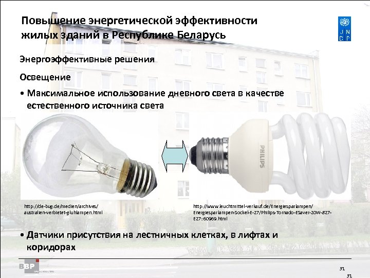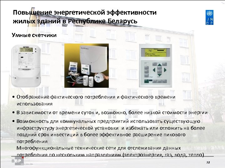 Повышение энергетической Residential Buildings Improving Energy Efficiency in эффективности жилых зданий в Belarus in the Republic of Республике Беларусь Энергоэффективные решения Освещение • Максимальное использование дневного света в качестве естественного источника света • Energy-efficient lamps http: //de-bug. de/medien/archives/ australien-verbietet-gluhlampen. html http: //www. leuchtmittel-verkauf. de/Energiesparlampen/ Energiesparlampen-Sockel-E-27/Philips-Tornado-ESaver-20 W-827 E 27: : 60969. html • Датчики присутствия на лестничных клетках, в лифтах и коридорах 31 31