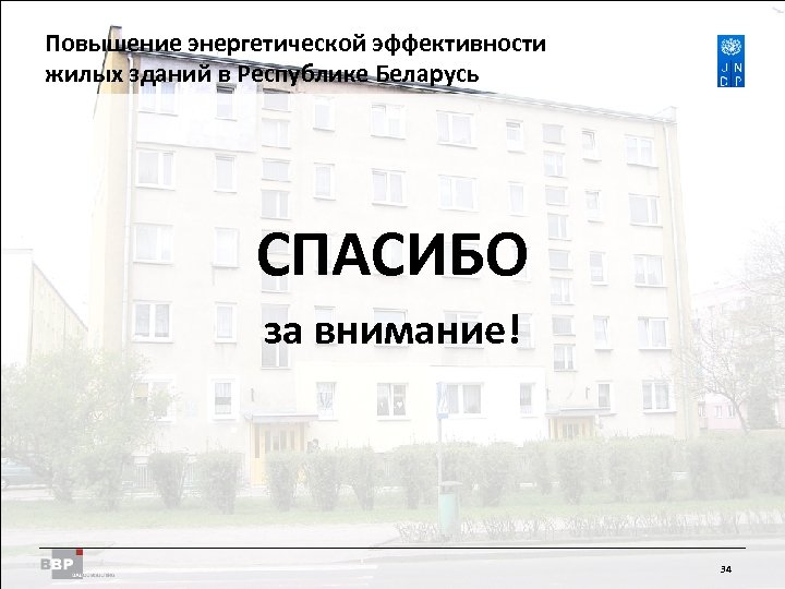 Повышение энергетической Residential Buildings Improving Energy Efficiency in эффективности жилых зданий в Belarus in the Republic of Республике Беларусь СПАСИБО за внимание! 34