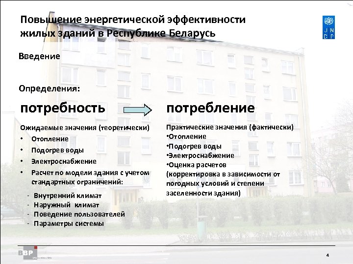 Повышение энергетической Residential Buildings Improving Energy Efficiency in эффективности жилых зданий в Belarus in the Republic of Республике Беларусь Введение Определения: Полезная энергия или чистая затрата энергии поступает жильцам в виде тепла, охлаждения или света quality of building Качество здания energetic effort for Затраты энергии на добычу, extraction, conversion and преобразование и transport of energy транспортировку энергии Конечная или доставленная энергия поставляется инженерными системами и включает потери в процессе преобразования, хранения, распределения и передачи primary energy effective energy Полезная энергия Первичная энергия общее количество энергии, включая всю энергию, использованную в процессе выработки и транспортировки final energy Конечная энергия performanceof technical Работа инженерных систем 3