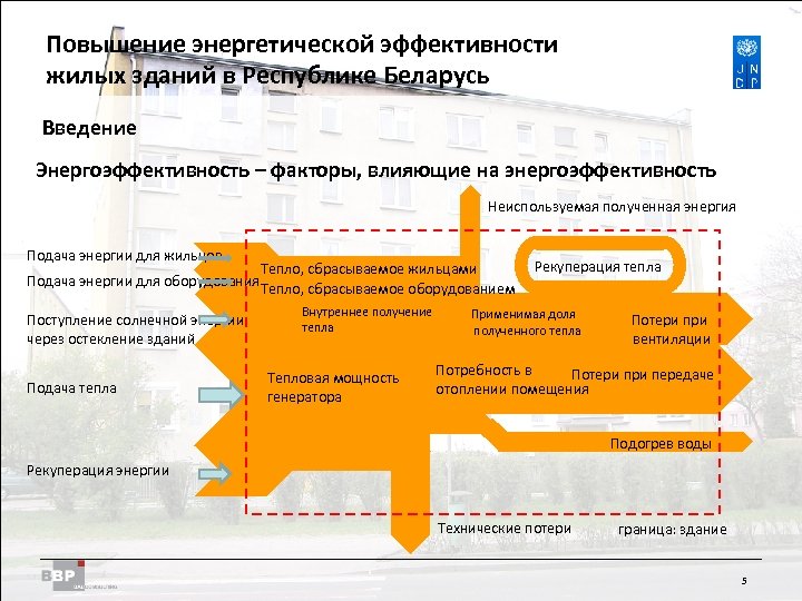 Повышение энергетической Residential Buildings Improving Energy Efficiency in эффективности жилых зданий в Belarus in the Republic of Республике Беларусь Введение Определения: потребность потребление Ожидаемые значения (теоретически) • Отопление • Подогрев воды • Электроснабжение • Расчет по модели здания с учетом стандартных ограничений: Практические значения (фактически) • Отопление • Подогрев воды • Электроснабжение • Оценка расчетов (корректировка в зависимости от погодных условий и степени заселенности здания) - Внутренний климат Наружный климат Поведение пользователей Параметры системы 4