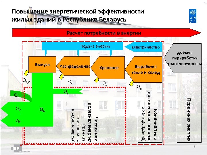 Повышение энергетической Residential Buildings Improving Energy Efficiency in эффективности жилых зданий в Belarus in the Republic of Республике Беларусь Расчет потребности в энергии Подача энергии Выпуск Распределение Qc, e Qd Выработка тепло и холод добыча переработка транспортировка Qg Первичная энергия Конечная или доставленная энергия (граница: здание) Чистая или полезная энергия QT Qh (граница: помещение с кондиционером) QV Qs Qi QS Хранение электричество 6