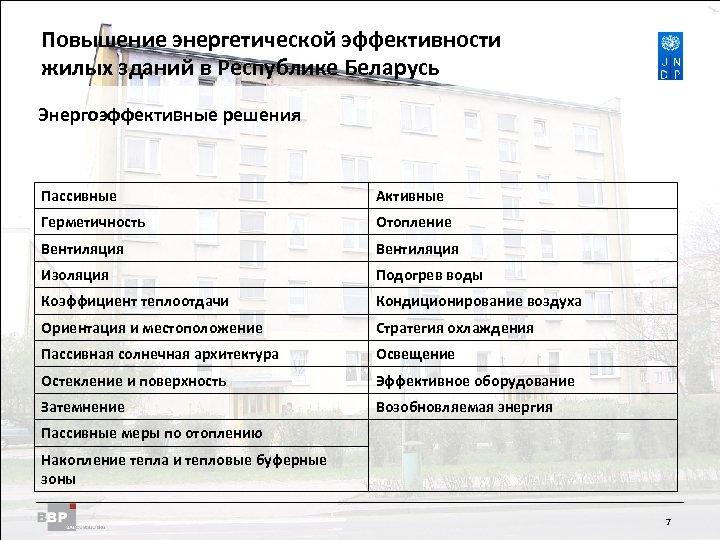 Повышение энергетической Residential Buildings Improving Energy Efficiency in эффективности жилых зданий в Belarus in the Republic of Республике Беларусь Энергоэффективные решения Пассивные Активные Герметичность Отопление Вентиляция Изоляция Подогрев воды Коэффициент теплоотдачи Кондиционирование воздуха Ориентация и местоположение Стратегия охлаждения Пассивная солнечная архитектура Освещение Остекление и поверхность Эффективное оборудование Затемнение Возобновляемая энергия Пассивные меры по отоплению Накопление тепла и тепловые буферные зоны 7