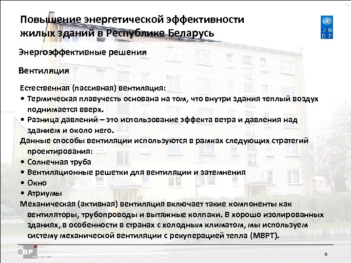 Повышение энергетической Residential Buildings Improving Energy Efficiency in эффективности жилых зданий в Belarus in the Republic of Республике Беларусь Энергоэффективные решения Герметичность • Сведение к минимуму потерь инфильтрацией • Комфорт • Preventing Mold Жидкая вода Испытания под давлением (метод «аэродверь» ) для обнаружения утечек воздуха. Приемлемый уровень герметичности: естественная вентиляция n 50 ≤ 3, 0 ч-1 Механическая вентиляция n 50 ≤ 1, 5 ч-1 n 50 = скорость воздухообмена при разнице давлений 50 Па (кратность воздухообменов в час) Кривая точки росы Водяной пар Внутренняя точка росы для здания 8