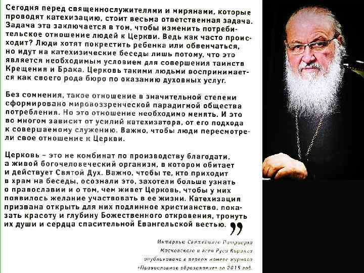 Состояние и проблемы катехизической деятельности на приходах Пермской епархии (по итогам анкетирования сентябрь 2016 г. ) Необходимо построение системы: 1. катехизаторской деятельности для взрослых на каждом приходе 2. в обмене опытом специалистов в области катехизации взрослых, а также повышении квалификации 3. в методическом сопровождении деятельности приходских катехизаторов, работающих со взрослыми 4. в освещении катехизаторской деятельности для взрослых в СМИ и интернет ресурсах 5. во взаимодействии и осуществлении совместной деятельности со светскими организациями, целью деятельности которых является духовно-нравственное просвещение