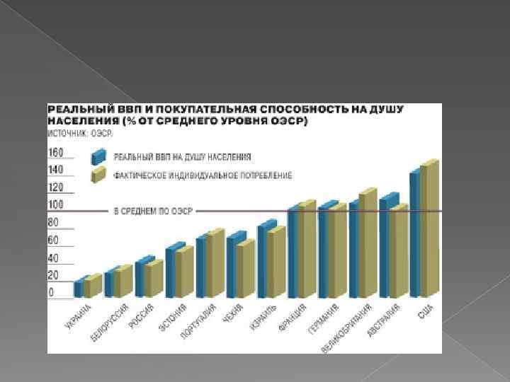Материальное благополучие Несмотря на то что показатель ВВП на душу населения — наиболее распространенный способ оценки экономической активности, сравнение уровня жизни не менее, а то и более важно. Из данных ОЭСР следует, что фактическое потребление на душу населения в России составляет 38% от среднего по ОЭСР, почти в два раза меньше, чем в Португалии и Израиле, в четыре раза меньше, чем в США. При этом Россия — одна из самых богатых стран, не входящих в ОЭСР. Заметную разницу между ВВП на душу населения и фактическим потреблением (см. диаграмму) в ОЭСР объясняют тем, что в таких странах, как Португалия, Великобритания и США, доля инвестиций в ВВП относительно низка, зато высока доля потребления. В России и, например, Австралии, Израиле и Чехии ситуация обратная. Впрочем, данные ОЭСР относятся к 2005 году — с тех пор и рубль существенно укрепился (примерно на четверть по отношению к доллару США), и из-за опережающего роста доходов населения заметно выросла и их доля в ВВП.