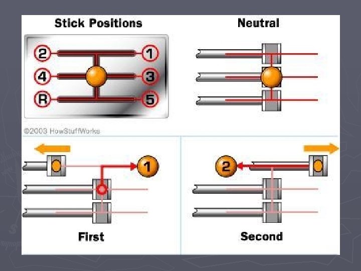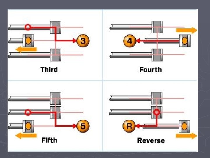 Manual transmission ► Purpose: optimize engine speed with varying wheel speed ► Ratios (ex. ): 2. 3: 1, 1. 6: 1, 1. 2: 1, 1: 1, 0. 9: 1 ► Parts § § § Input shaft Layshaft Gears (incl. idler) Output shaft Dog collars Synchronizers