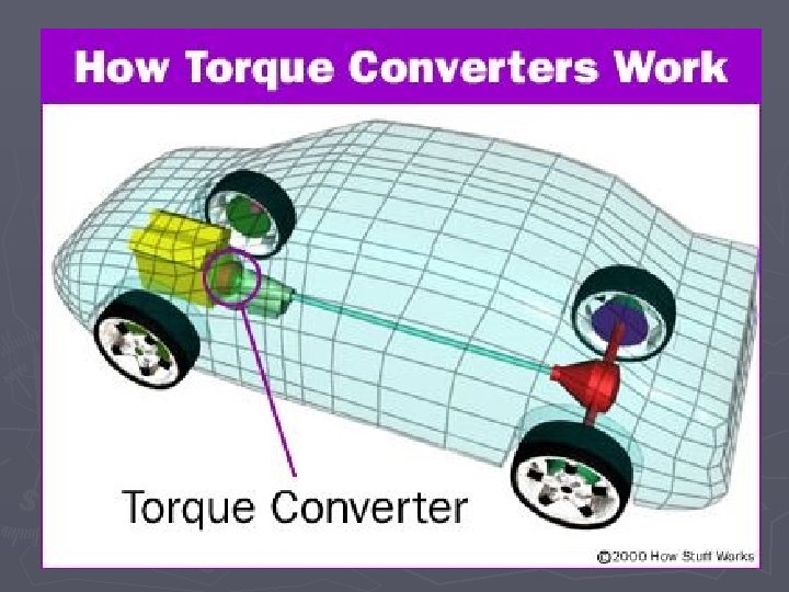 Torque converter ► Purpose: allow engine to run with trans. stopped ► Fluid coupling ► Parts: § Pump § Fluid § Turbine § Stator ► Slippage: 2 -8% power loss § Lock-up torque converters