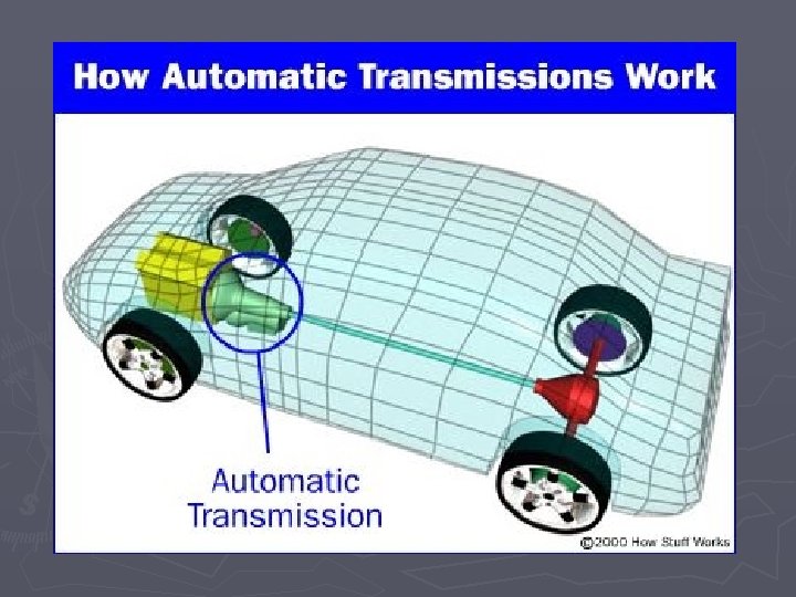 Automatic transmission [1] ► Purpose: to keep engine within optimal rpm ► Planetary gearsets § Components: ► Ring ► Sun ► Planet carrier § Ratios created through combinations: ► Reduction: sun input, planet carrier output, ring stationary ► Overdrive: planet carrier input, ring output, sun stationary ► Reverse: sun input, ring output, planet carrier stationary