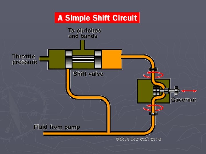 The Governor ► clever valve that tells the transmission how fast the car is going. It is connected to the output, so the faster the car moves, the faster the governor spins ► Inside the governor is a spring-loaded valve that opens in proportion to how fast the governor is spinning