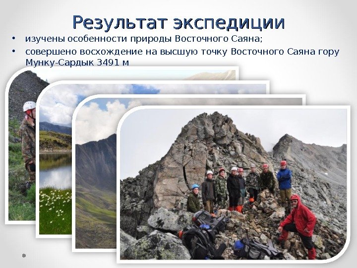 Результат экспедиции • изучены особенности природы Восточного Саяна; • совершено восхождение на высшую точку Восточного Саяна гору Мунку-Сардык 3491 м