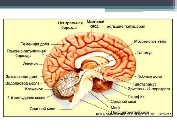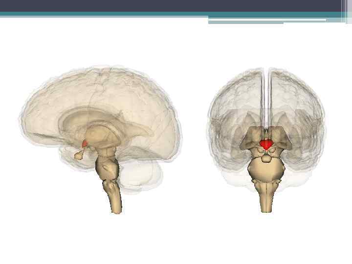 • Гипоталамус «комната, камера, — небольшая область в промежуточном мозге, включающая в себя большое число групп клеток (свыше 30 ядер), которые регулируют нейроэндокринную деятельность мозга и гомеостаз организма. Гипоталамус связан нервными путями практически со всеми отделами центральной нервной системы, включая кору, гиппокамп, миндалину, мозжечок, ств ол мозга и спинной мозг. Вместе с гипофизом гипоталамус образует гипоталамо-гипофизарную систему, в которой гипоталамус управляет выделением гормонов гипофиза и является центральным связующим звеном между нервной и эндокринной системами. Он выделяет гормоны и нейропептиды и регулирует такие функции, как ощущение голода и жажды, терморегуляция организ ма, половое поведение, сон и бодрствование (циркадные ритмы).