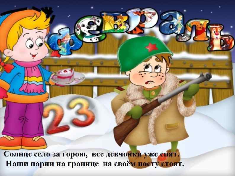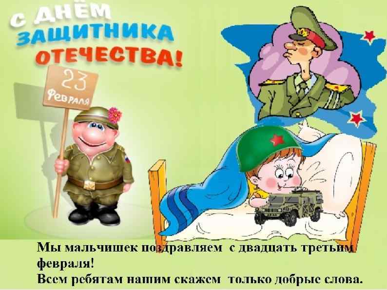 Мальчишки классные у нас — и сильные, и смелые, И на уроках каждый раз — разумные, умелые! Вас с 23 Февраля сердечно поздравляем, Учиться и вести себя, отлично пожелаем! Пусть будет все у вас О-кей в учебе, спорте, всюду, Чтоб не болели никогда ни гриппом, ни простудой, Чтоб не пришлось вам воевать, а лишь творить и строить, За мир и счастье на земле бороться людям стоит!