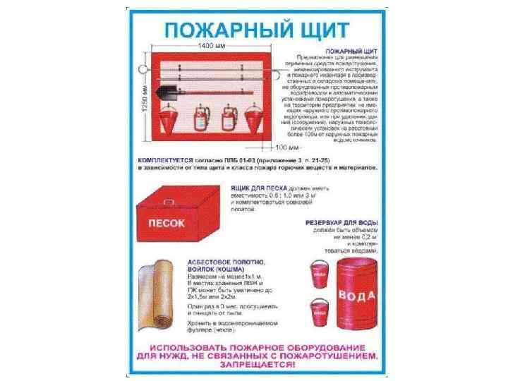 Пожарный щит предназначен для размещения первичных средств пожаротушения, механизированного инструмента и пожарного инвентаря в производственных и складских помещениях не оборудованных противопожарным водопроводом и автоматическими установками пожаротушения, а также на территории предприятий, не имеющих наружного противопожарного водопровода, или при удалении сооружений (зданий), наружных технологических установок на расстоянии более 1000 м. от наружных пожарных водоисточников. В комплект пожарных щитов входят: лом, багор, топор, лопата штыковая или совковая и два конусных ведра.