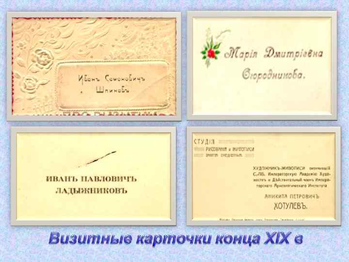 В России первые визитные карточки появились во времена правления Екатерины II Великой, то есть ко второй половине XVIII века. Это был так называемый “золотой век” дворянства, когда все должно было быть роскошно и красиво, не хуже, чем в “какой-то там Франции”. Визитные карточки, или визитные билеты (“в народе”), продолжали оставаться отличительным знаком лиц благородного происхождения и, например, купец, даже очень богатый и известный не имел права пользоваться ими.