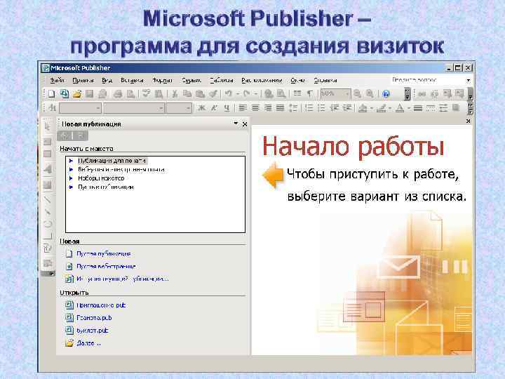 1. 2. 3. 4. 5. - Запуск программы ( двойной щелчок) В открывшемся окне Microsoft Publisher в пункте Начать с макета выбрать Публикации для печати (щелчок левой кнопкой мыши). Визитные карточки – выбрать макет визитной карточки (двойной щелчок). Если вы хотите просмотреть поближе другие макеты Макеты публикаций. Выберите понравившийся макет 7. Поэкспериментируйте с цветом: Цветовые схемы, примените любую из понравившихся цветовых схем. Поэкспериментируйте с шрифтами: Шрифтовые схемы, примените любую из понравившихся шрифтовых схем Введите свои данные. 8. Сохраните публикацию: Файл /Сохранить как (вместо слова Публикация введите своё имя. 6.