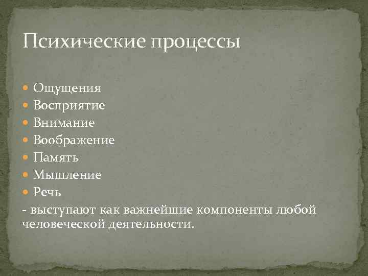 Психические процессы Ощущения Восприятие Внимание Воображение Память Мышление Речь - выступают как важнейшие компоненты любой человеческой деятельности.