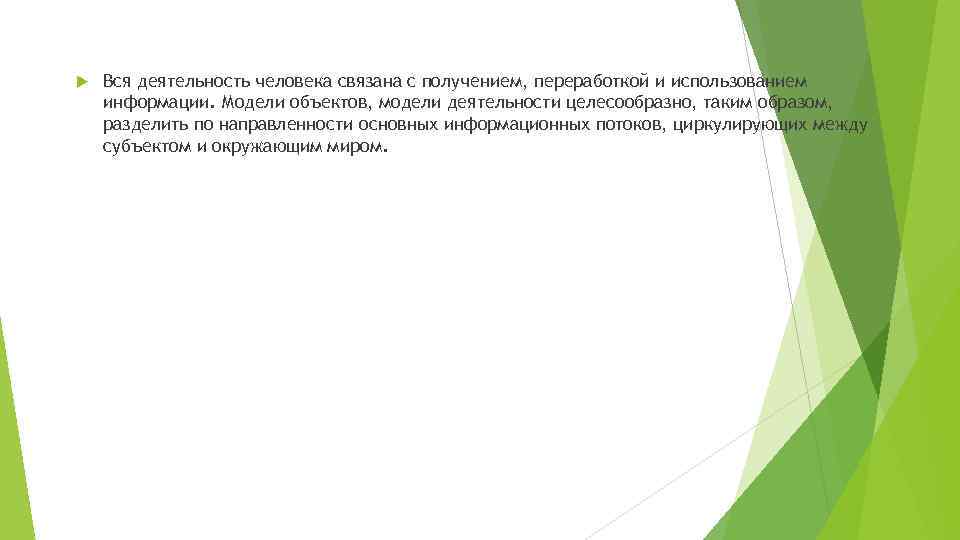 Вся деятельность человека связана с получением, переработкой и использованием информации. Модели объектов, модели деятельности целесообразно, таким образом, разделить по направленности основных информационных потоков, циркулирующих между субъектом и окружающим миром.
