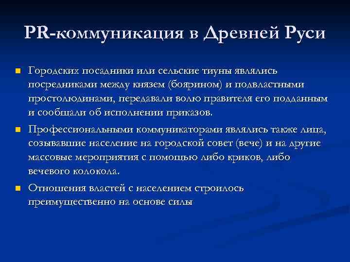 PR-коммуникация в Древней Руси n n n Городских посадники или сельские тиуны являлись посредниками между князем (боярином) и подвластными простолюдинами, передавали волю правителя его подданным и сообщали об исполнении приказов. Профессиональными коммуникаторами являлись также лица, созывавшие население на городской совет (вече) и на другие массовые мероприятия с помощью либо криков, либо вечевого колокола. Отношения властей с населением строилось преимущественно на основе силы
