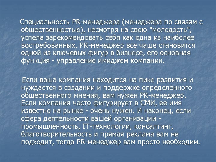 Специальность PR-менеджера (менеджера по связям с общественностью), несмотря на свою "молодость", успела зарекомендовать себя как одна из наиболее востребованных. PR-менеджер все чаще становится одной из ключевых фигур в бизнесе, его основная функция - управление имиджем компании. Если ваша компания находится на пике развития и нуждается в создании и поддержке определенного общественного мнения, вам нужен PR-менеджер. Если компания часто фигурирует в СМИ, ее имя известно на рынке - очень нужен. И наконец, если сфера деятельности вашей организации - промышленность, IT-технологии, консалтинг, благотворительность и прямая реклама вам не подходит, тогда PR-менеджер вам просто необходим.