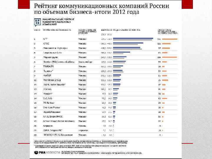 • 2012 год стал наиболее успешным для мировой отрасли Public Relations, причем Россия по темпу роста доходов (20%) названа одним из наиболее перспективных и быстроразвивающихся рынков PRуслуг, а в 2013 году ожидается продолжение активного роста.
