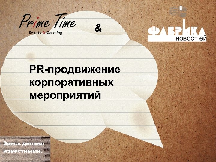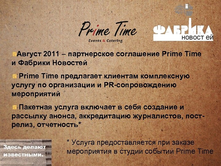 Август 2011 – партнерское соглашение Prime Time и Фабрики Новостей Prime Time предлагает клиентам комплексную услугу по организации и PR-сопровождению мероприятий Пакетная услуга включает в себя создание и рассылку анонса, аккредитацию журналистов, пострелиз, отчетность* * Услуга предоставляется при заказе мероприятия в студии событий Prime Time