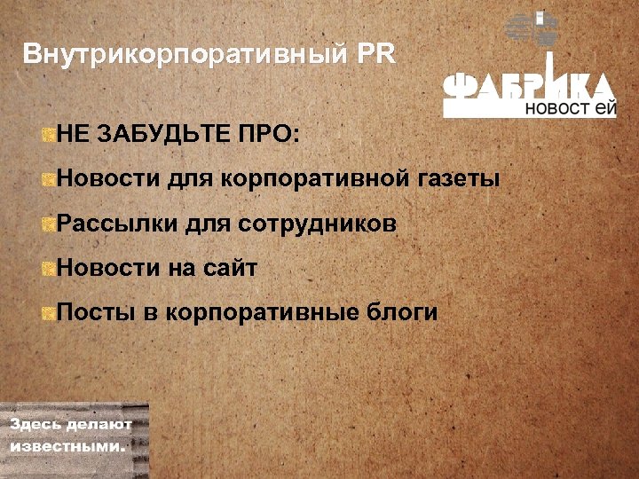 Внутрикорпоративный PR НЕ ЗАБУДЬТЕ ПРО: Новости для корпоративной газеты Рассылки для сотрудников Новости на сайт Посты в корпоративные блоги