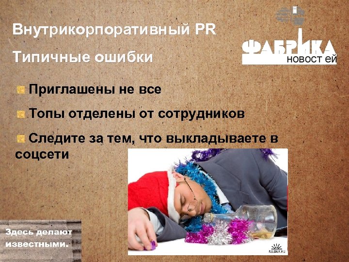 Внутрикорпоративный PR Типичные ошибки Приглашены не все Топы отделены от сотрудников Следите за тем, что выкладываете в соцсети