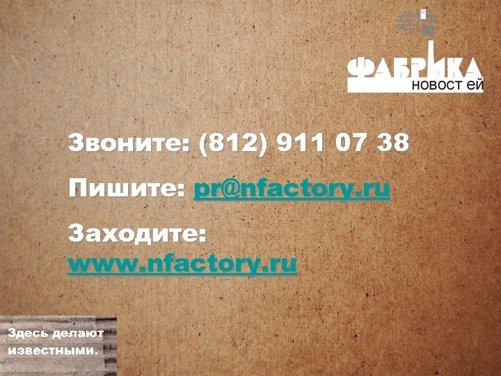 Звоните: (812) 911 07 38 Пишите: pr@nfactory. ru Заходите: www. nfactory. ru