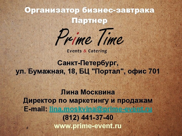 Организатор бизнес-завтрака Партнер Санкт-Петербург, ул. Бумажная, 18, БЦ "Портал", офис 701 Лина Москвина Директор по маркетингу и продажам E-mail: lina. moskvina@prime-event. ru (812) 441 -37 -40 www. prime-event. ru