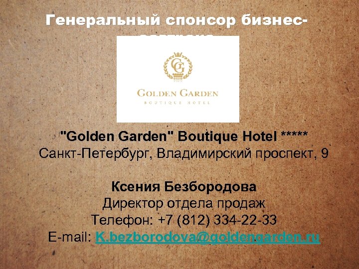 Генеральный спонсор бизнесзавтрака "Golden Garden" Boutique Hotel ***** Санкт-Петербург, Владимирский проспект, 9 Ксения Безбородова Директор отдела продаж Телефон: +7 (812) 334 -22 -33 E-mail: K. bezborodova@goldengarden. ru