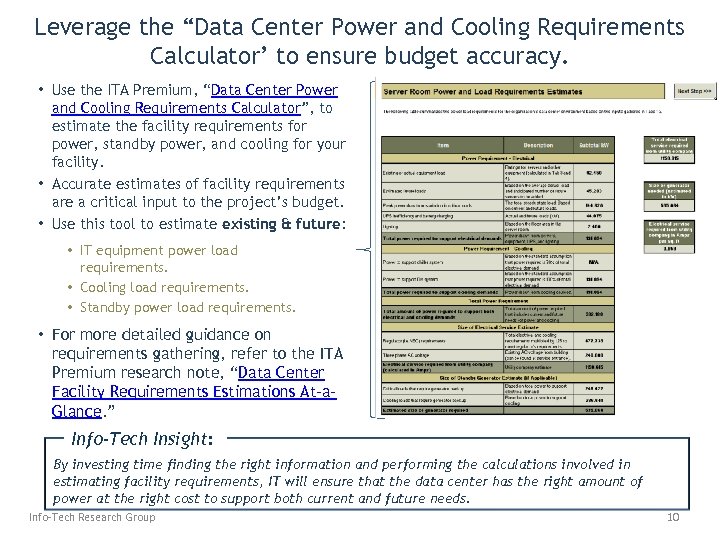 Leverage the “Data Center Power and Cooling Requirements Calculator’ to ensure budget accuracy. • Use the ITA Premium, “Data Center Power and Cooling Requirements Calculator”, to estimate the facility requirements for power, standby power, and cooling for your facility. • Accurate estimates of facility requirements are a critical input to the project’s budget. • Use this tool to estimate existing & future: • IT equipment power load requirements. • Cooling load requirements. • Standby power load requirements. • For more detailed guidance on requirements gathering, refer to the ITA Premium research note, “Data Center Facility Requirements Estimations At-a. Glance. ” Info-Tech Insight: By investing time finding the right information and performing the calculations involved in estimating facility requirements, IT will ensure that the data center has the right amount of power at the right cost to support both current and future needs. Info-Tech Research Group 10