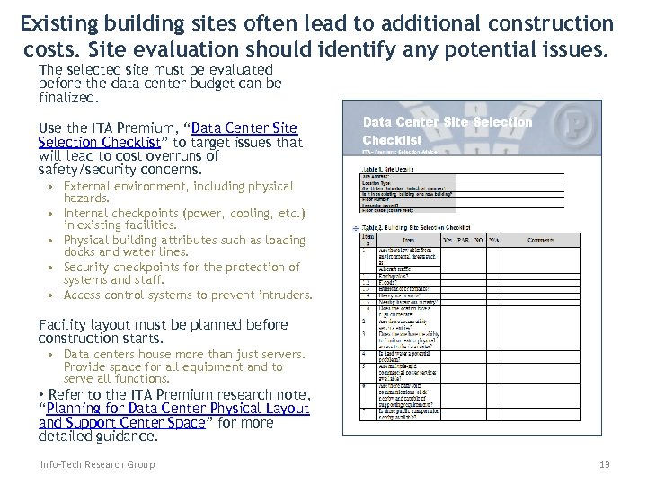 Fire protection is not solely about IT assets but additional protection must be evaluated to avoid unnecessary costs. • • The number one consideration when evaluating fire protection options is life safety in the data center. It is mandated by law and non-negotiable. While clean agents can be very effective in suppressing fire and protecting property, they are also expensive to install and maintain and, may be toxic. Refer to the ITA Premium research note, “Fire Protection: Only YOU Can Prevent Data Center Fires” for more detailed guidance. Under NFPA 75 a data center must have a sprinkler system, detection and alarm systems, emergency power-off, and portable fire extinguishers. Non-Mandatory Solutions: Risk and Cost of Downtime $35. 77/sq. ft. +341% $8. 12/sq. ft. Mandatory Fire Protection Additional Fire Protection Info-Tech Insight: Additional protection to property such as pre-action sprinklers, piping, and clean agent systems must be evaluated rather than installed by default. Info-Tech Research Group 12