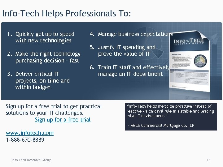 Info-Tech Helps Professionals To: 1. Quickly get up to speed with new technologies 2. Make the right technology purchasing decision – fast 3. Deliver critical IT projects, on time and within budget 4. Manage business expectations 5. Justify IT spending and prove the value of IT 6. Train IT staff and effectively manage an IT department Sign up for a free trial to get practical solutions to your IT challenges. Sign up for a free trial “Info-Tech helps me to be proactive instead of reactive – a cardinal rule in a stable and leading edge IT environment. ” - ARCS Commercial Mortgage Co. , LP www. infotech. com 1 -888 -670 -8889 Info-Tech Research Group 16