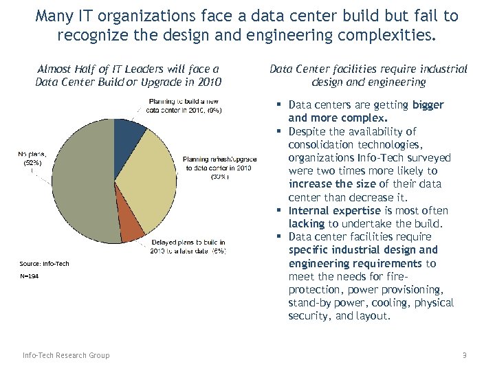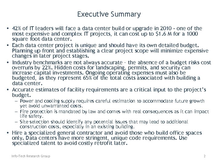 Executive Summary • 42% of IT leaders will face a data center build or upgrade in 2010 - one of the most expensive and complex IT projects, it can cost up to $1. 6 M for a 1000 square foot data center. • Each data center project is unique and should have its own detailed budget. Planning up front and establishing a clear project scope will minimize expensive changes in later project stages. • Industry benchmarks are not always accurate – the absence of a budget risks cost overruns by 22%. Hidden costs for landscaping, permits, and security can increase capital investments. Ongoing operating expenses must also be budgeted, as they represent 65% of the total costs associated with building a data center. • Accurate estimates of facility requirements are a critical input to the project’s budget. – Power and cooling supply requires careful estimation to accommodate future growth yet avoid unwarranted costs. – Fire protection is mandated by law and comes with real consequences as it can impact life safety. – Site selection should identify any potential issues that may lead to additional construction costs, especially in an existing building. • Hire a specialized general contractor and avoid those who build office spaces only. Data centers have more stringent, unique code requirements. Use specialized talent to avoid costly retrofit later. Info-Tech Research Group 2