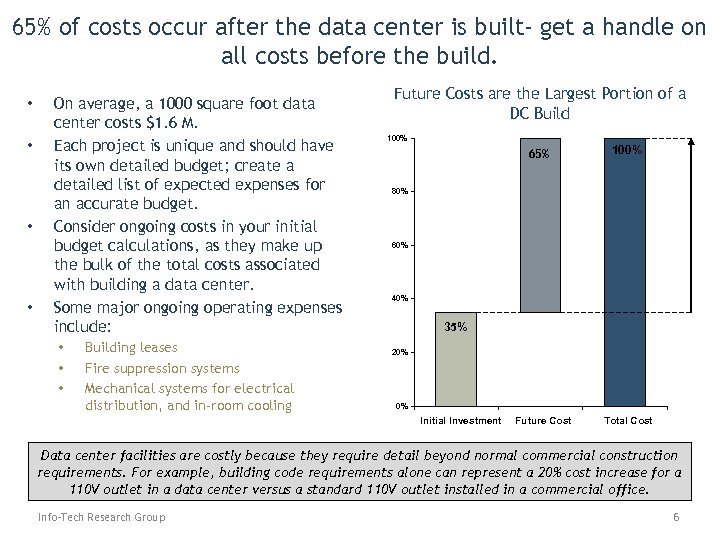 65% of costs occur after the data center is built- get a handle on all costs before the build. • • On average, a 1000 square foot data center costs $1. 6 M. Each project is unique and should have its own detailed budget; create a detailed list of expected expenses for an accurate budget. Consider ongoing costs in your initial budget calculations, as they make up the bulk of the total costs associated with building a data center. Some major ongoing operating expenses include: • • • Building leases Fire suppression systems Mechanical systems for electrical distribution, and in-room cooling Future Costs are the Largest Portion of a DC Build 100% 65% 100% 80% 60% 40% 35% 20% 0% Initial Investment Future Cost Total Cost Data center facilities are costly because they require detail beyond normal commercial construction requirements. For example, building code requirements alone can represent a 20% cost increase for a 110 V outlet in a data center versus a standard 110 V outlet installed in a commercial office. Info-Tech Research Group 6