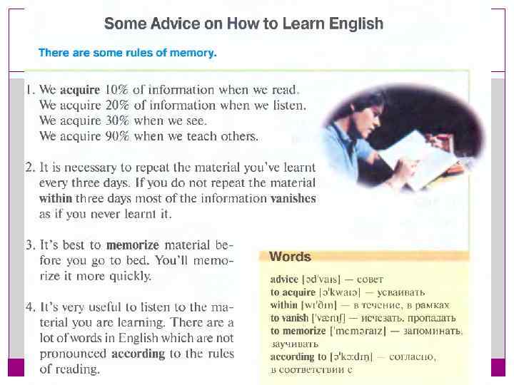 How do we learn better? (%) acquire – приобретать, овладевать / есте сақтау Lecture: we acquire ____ % of information when we listen Reading: we acquire ____ % of information when we read Audio-visual: we acquire ____ % of information when we listen Demonstration: we acquire ____ % of information when we see Discussion: we acquire ____ % of information when we discuss Practice: we acquire ____ % of information when we practice Teaching: we acquire ____ % of information when we teaching