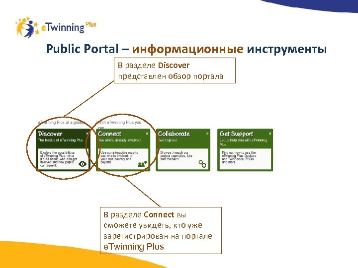 Public Portal – информационные инструменты В разделе Discover представлен обзор портала В разделе Connect вы сможете увидеть, кто уже зарегистрирован на портале e. Twinning Plus