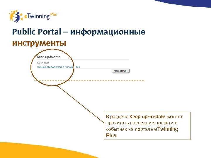 Public Portal – информационные инструменты В разделе Keep up-to-date можно прочитать последние новости о событиях на портале e. Twinning Plus