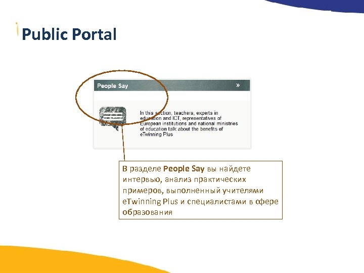 Public Portal В разделе People Say вы найдете интервью, анализ практических примеров, выполненный учителями e. Twinning Plus и специалистами в сфере образования