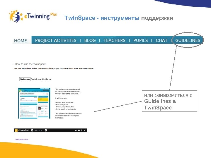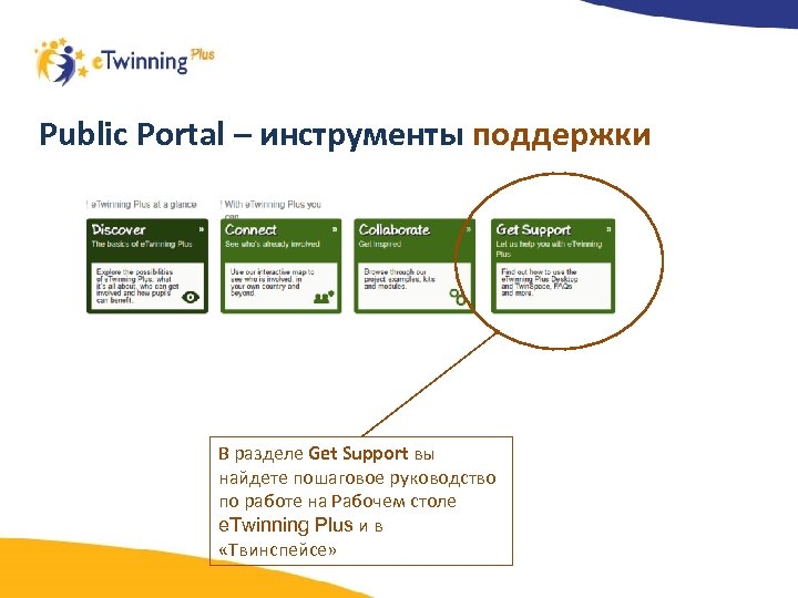 Public Portal – инструменты поддержки В разделе Get Support вы найдете пошаговое руководство по работе на Рабочем столе e. Twinning Plus и в «Твинспейсе»