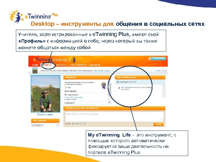 Desktop – инструменты для общения в социальных сетях Учителя, зарегистрированные в e. Twinning Plus, имеют свой «Профиль» с информацией о себе, через который вы также можете общаться между собой My e. Twinning Life - это инструмент, с помощью которого автоматически фиксируется ваша деятельность на портале e. Twinning Plus