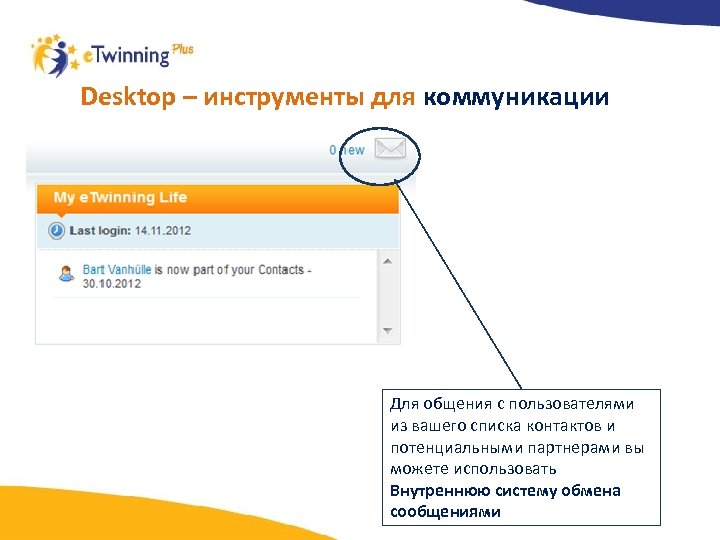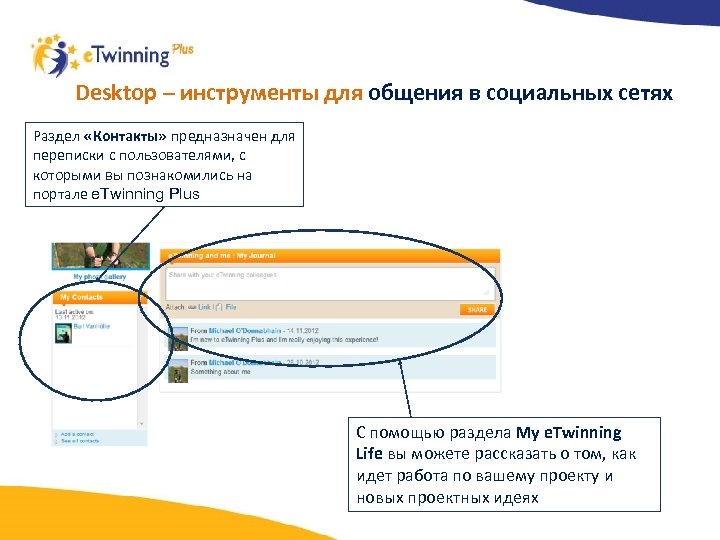 Desktop – инструменты для общения в социальных сетях Раздел «Контакты» предназначен для переписки с пользователями, с которыми вы познакомились на портале e. Twinning Plus С помощью раздела My e. Twinning Life вы можете рассказать о том, как идет работа по вашему проекту и новых проектных идеях