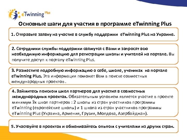 Основные шаги для участия в программе e. Twinning Plus 1. Отправьте заявку на участие в службу поддержки e. Twinning Plus на Украине. 2. Сотрудники службы поддержки свяжутся с Вами и запросят всю необходимую информацию для регистрации школы и учителей на портале. Вы получите доступ к порталу e. Twinning Plus. 3. Разместите подробную информацию о себе, школе, учениках на портале e. Twinning Plus. Эта информация поможет Вам в поиске совместных международных проектов. 4. Займитесь поиском школ партнеров для участия в совместных международных проектах. Обязательным условием является участие в проекте минимум 3 х школ партнеров : 2 школы из стран участников программы e. Twinning (европейские школы) и 1 школа из стран участников программы e. Twinning Plus (Украина, Армения, Грузия, Молдова, Азербайджан). 5. Участвуйте в проектах и обменивайтесь опытом с учителями из других стран.