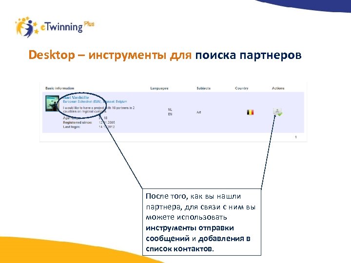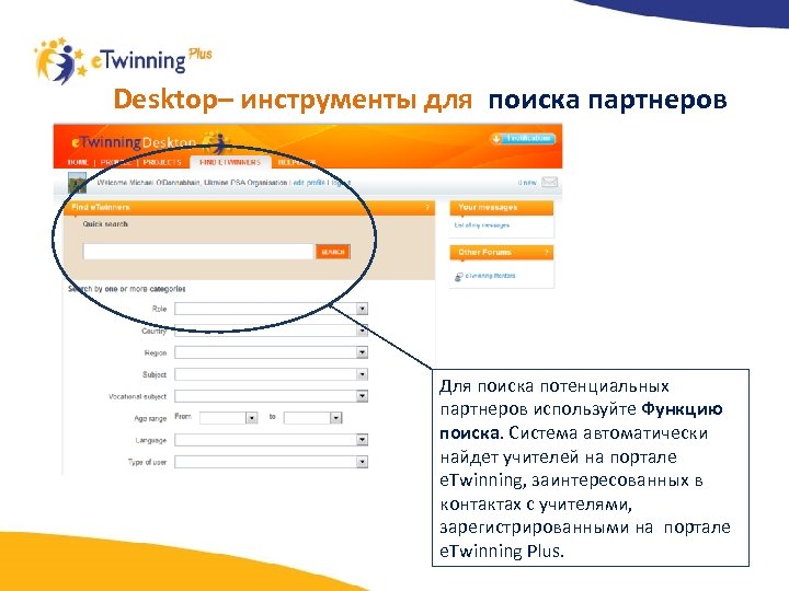 Desktop– инструменты для поиска партнеров Для поиска потенциальных партнеров используйте Функцию поиска. Система автоматически найдет учителей на портале e. Twinning, заинтересованных в контактах с учителями, зарегистрированными на портале e. Twinning Plus.